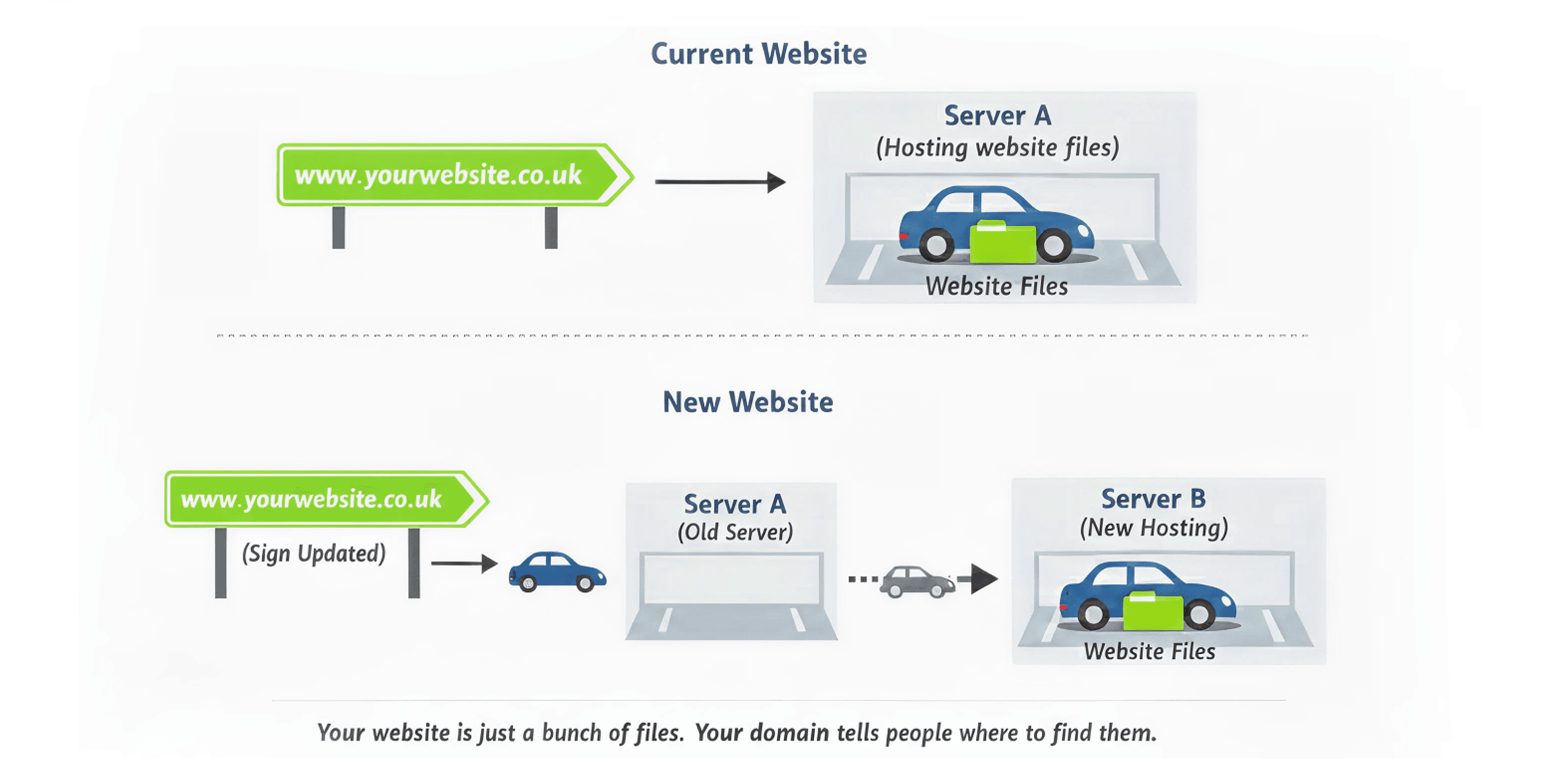 Right now, your website might be parked in one car park. When a new website goes live, all we do is move the car to a new car park and update the street sign to point there instead.